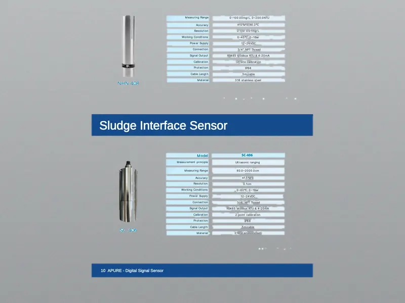 Ultrasonic/optical sludge-water interface sensor. Range 0–10 m, IP68, RS485 + 4-20mA output.